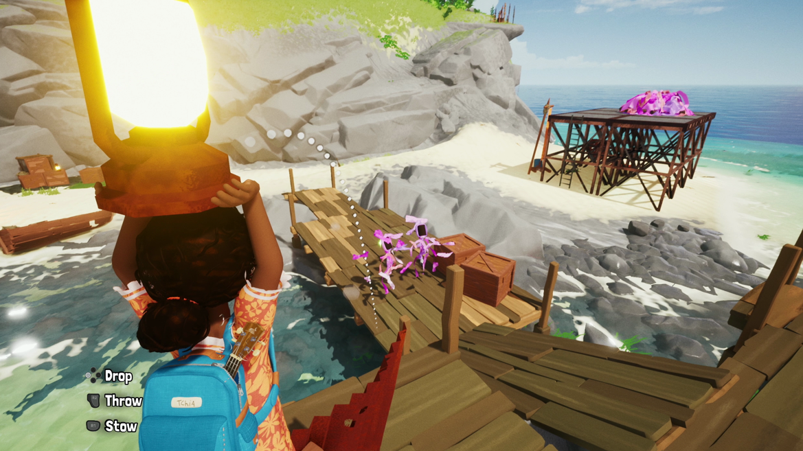 Customization is also a fun feature to the game. As you explore the world, you have the chance to find various chests, complete smaller tasks, and purchase various items. All of these actions unlock numerous items that can help customize Tchia’s outfit, her hair, and even her boat. I found myself more aligned with a summer and traditional look for Tchia, but there’s also modern outfits as well as outfits inspired by other indie games that can be fun to scope out.